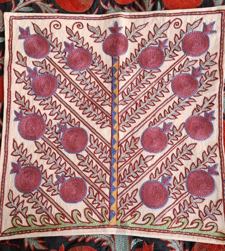 Hand embroidered Suzani Pillow cover, Suzani cushion, Decorative Pillow, pillow case, Handmade Suzani Pillow Cover from Uzbekistan. Suzani Pillow cover 45×45 cm -cotton/silk base -cotton/silk embroideries These intricate and lovingly-made textiles can be used in so many ways to add texture, romance, and delight to any room. "Suzani" means needlework, but to most collectors, the word has a more specific meaning: "suzani" is synonymous with the glorious embroideries of Uzbekistan, in Central Asia. In recent years, we've witnessed a remarkable revival of this old traditional art form. These textiles are pretty complex, which indicates their importance. In fact, suzanis were part of a bride’s dowry, generally started at the birth of a daughter and continued with the help of family and friends until the bride’s dowry was complete and ready to be presented to the groom at the wedding. It was a symbol of the family’s status, as the wealthier families could put more time and effort into making their suzanis. So, it was important to make really great suzanis, as your family would be judged by them. The suzani itself was used as the coverlet for the bridal bed on the wedding night, and later as decoration. Suzanis usually have a cotton (sometimes silk) fabric base, which is embroidered in silk or cotton thread. The dye materials used include madder, cochineal, indigo, walnut, pomegranate, and sumak, along with assorted others. On lustrous silks, the results are deep, rich, mellow, and glowing.Popular design motifs include sun and moon disks, meandering grapevines along the border and stylized botanical motifs, flowers, especially tulips, carnations, irises and pomegranate, a traditional symbol of fertility, and occasional fish and birds.Each Suzani produced reflect the talent, wealth and prosperity of the family while the embroidery motifs carry symbolic meaning relating to fertility, protection, health and household stability. The story of each Suzanis is as rich as their colors, as intricate as the designs that cover their surfaces. The fabrics are often lightly dyed to produce a soft beige tint, a so-called “tea wash.” Occasionally other colors are used for the ground fabrics. For large Suzanis, several of the fabric strips are first sewn loosely together, an elder of the tribe or village draws her design on the fabric after which it is taken apart again. Each female member of the family embroiders a separate strip. The pieces are then re-assembled as one.
