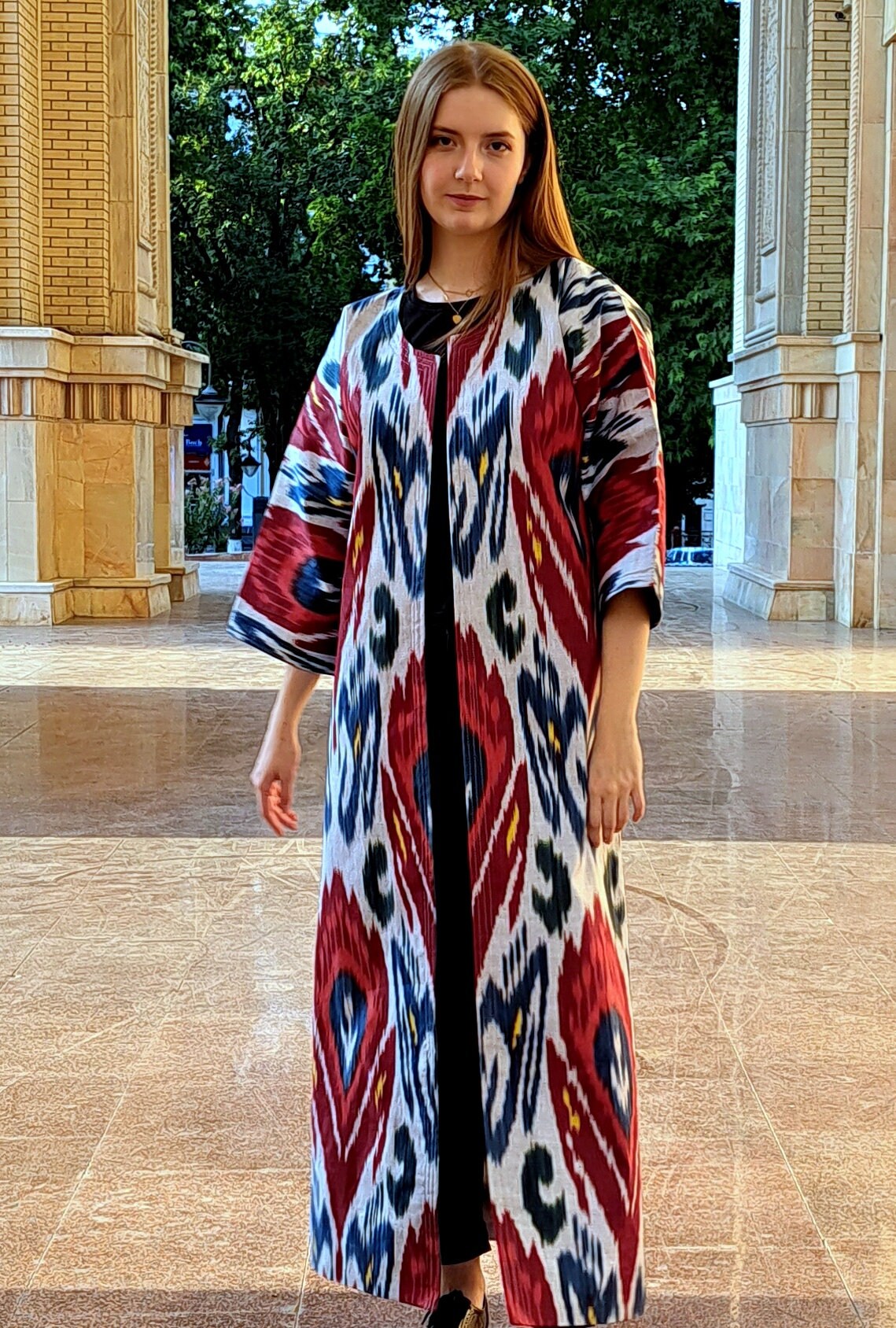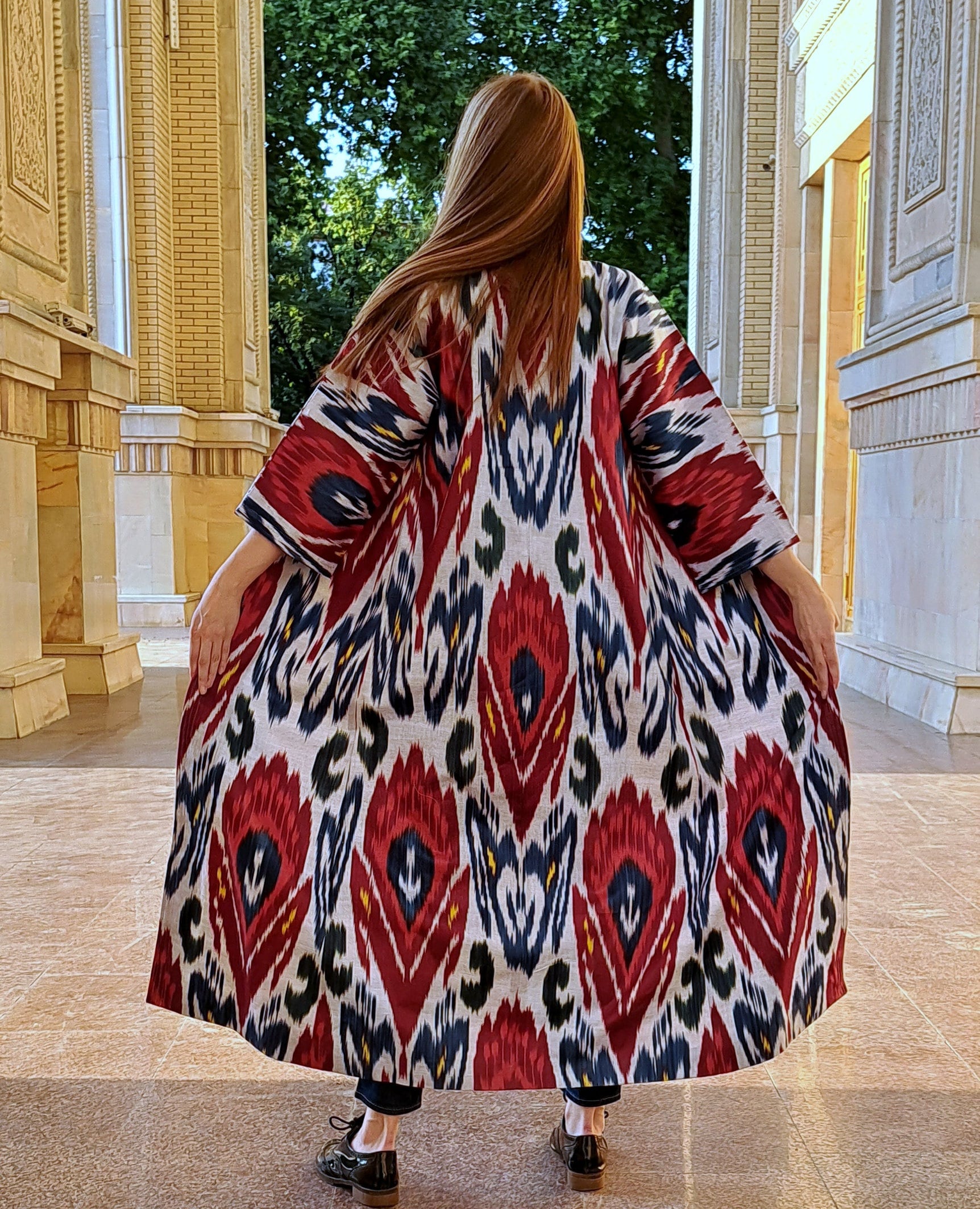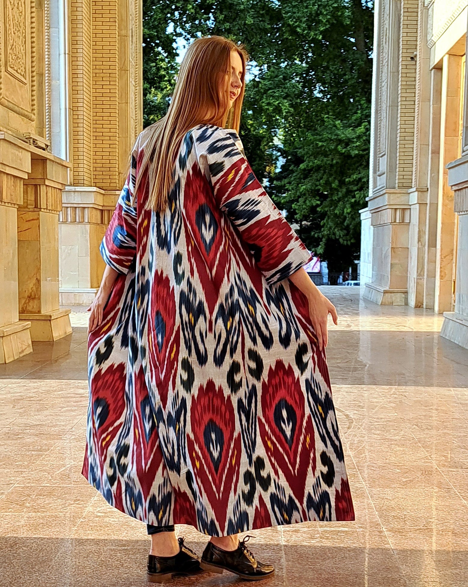 Chapan 30% silk,70%cotton made from handwoven ikat which are unique (the technology of ikat manufacturing is quite complicated and includes 37 steps) .