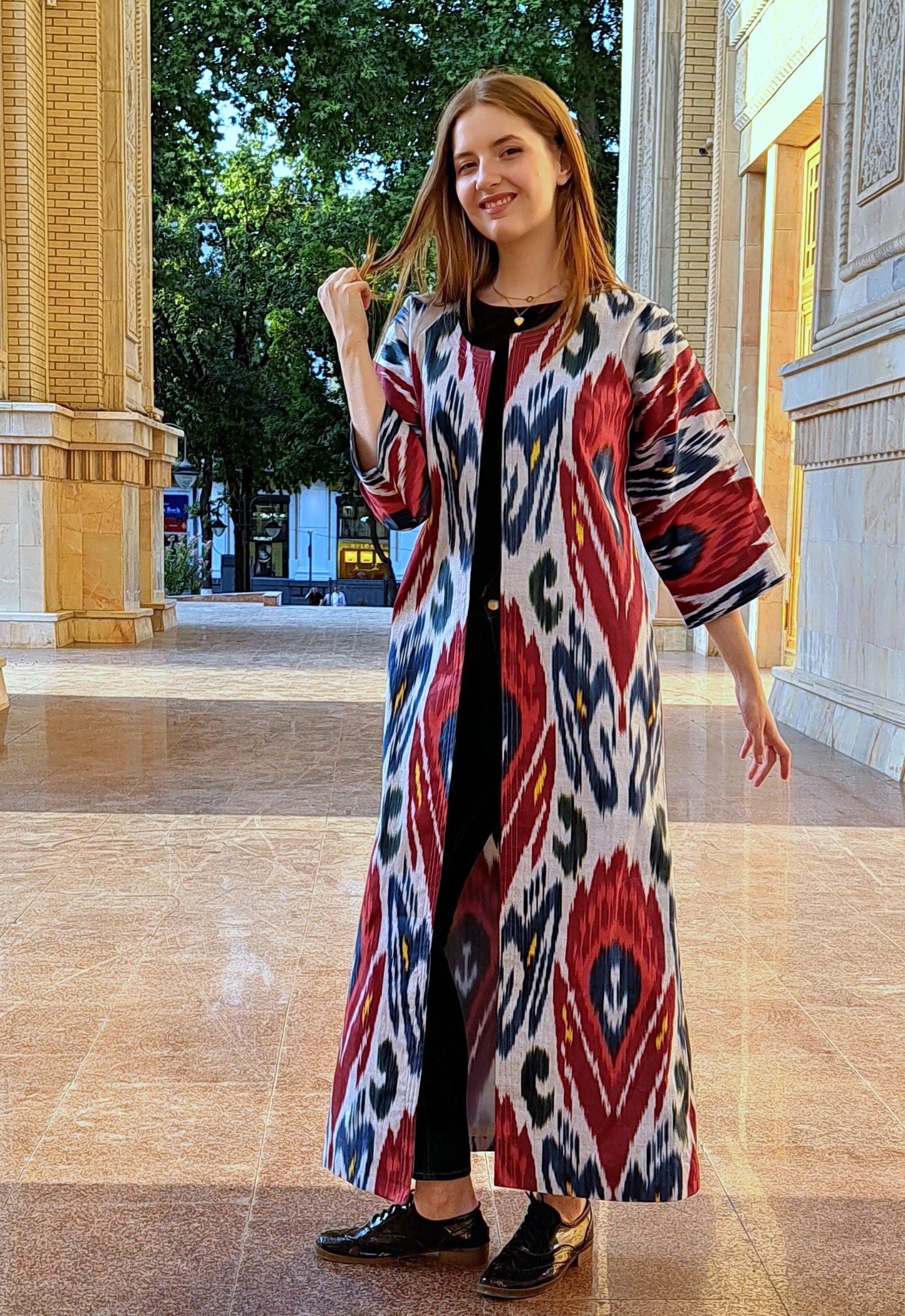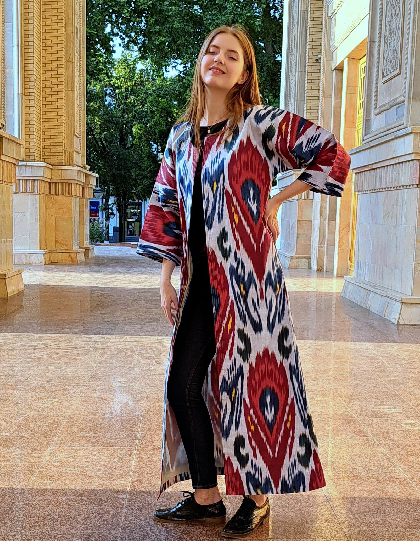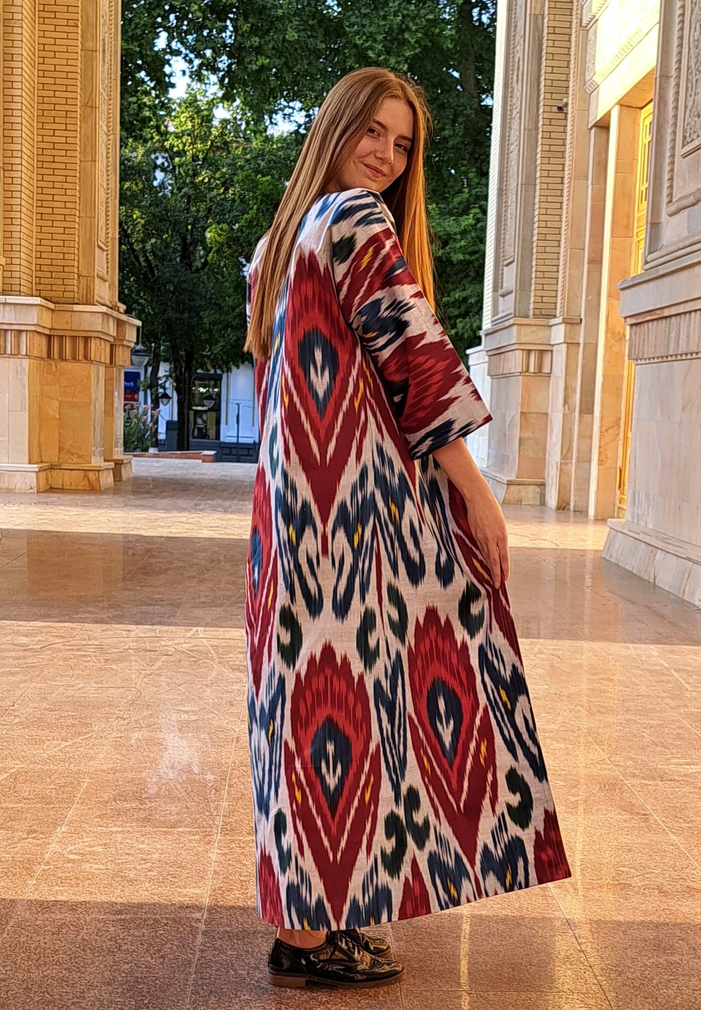 Chapan 30% silk,70%cotton made from handwoven ikat which are unique (the technology of ikat manufacturing is quite complicated and includes 37 steps) .