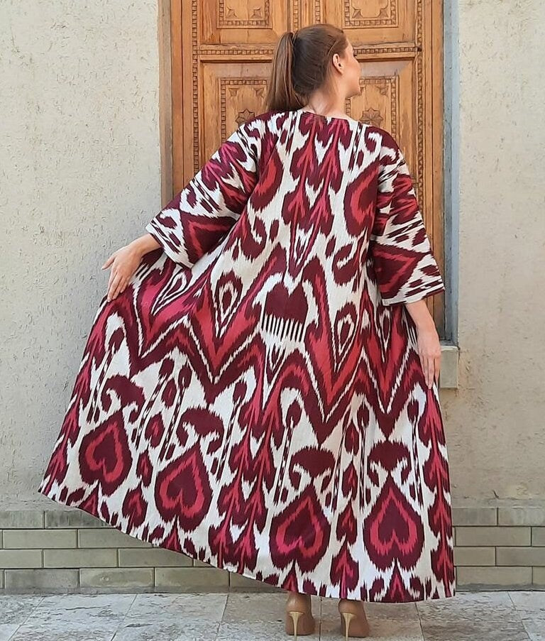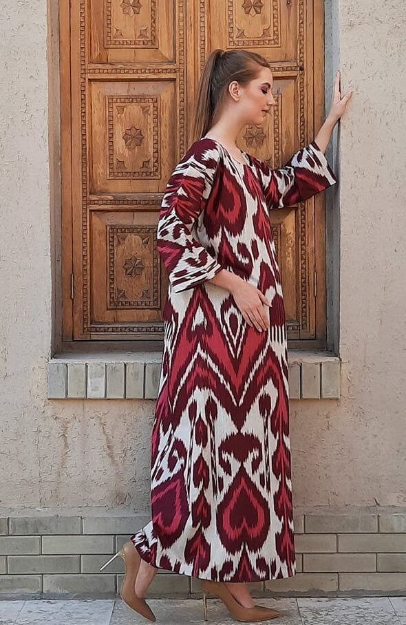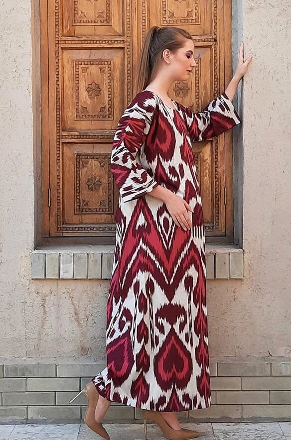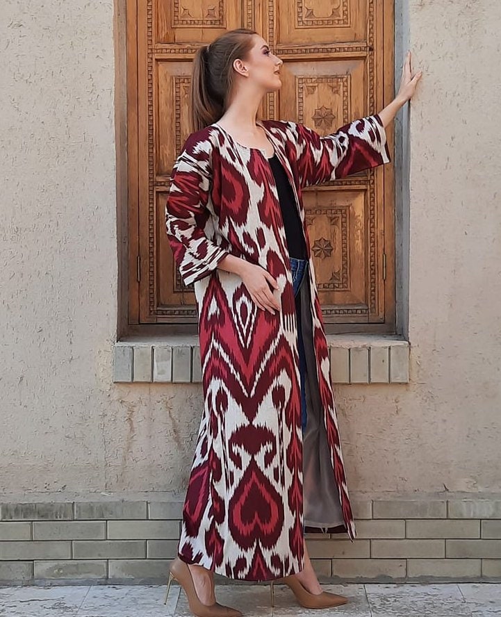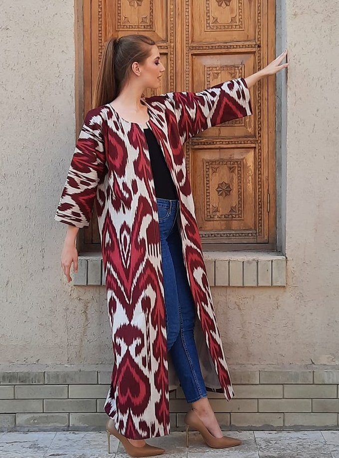 Chapan 30% silk,70%cotton made from handwoven ikat which are unique (the technology of ikat manufacturing is quite complicated and includes 37 steps) .
