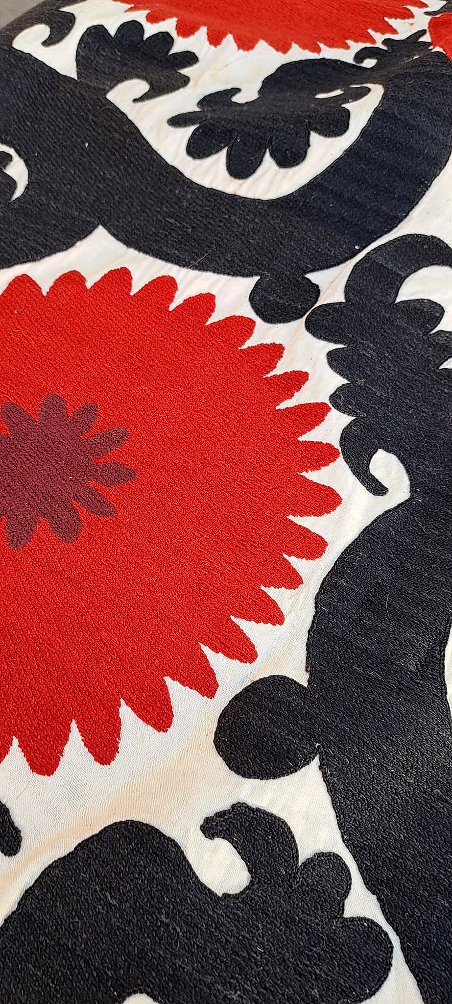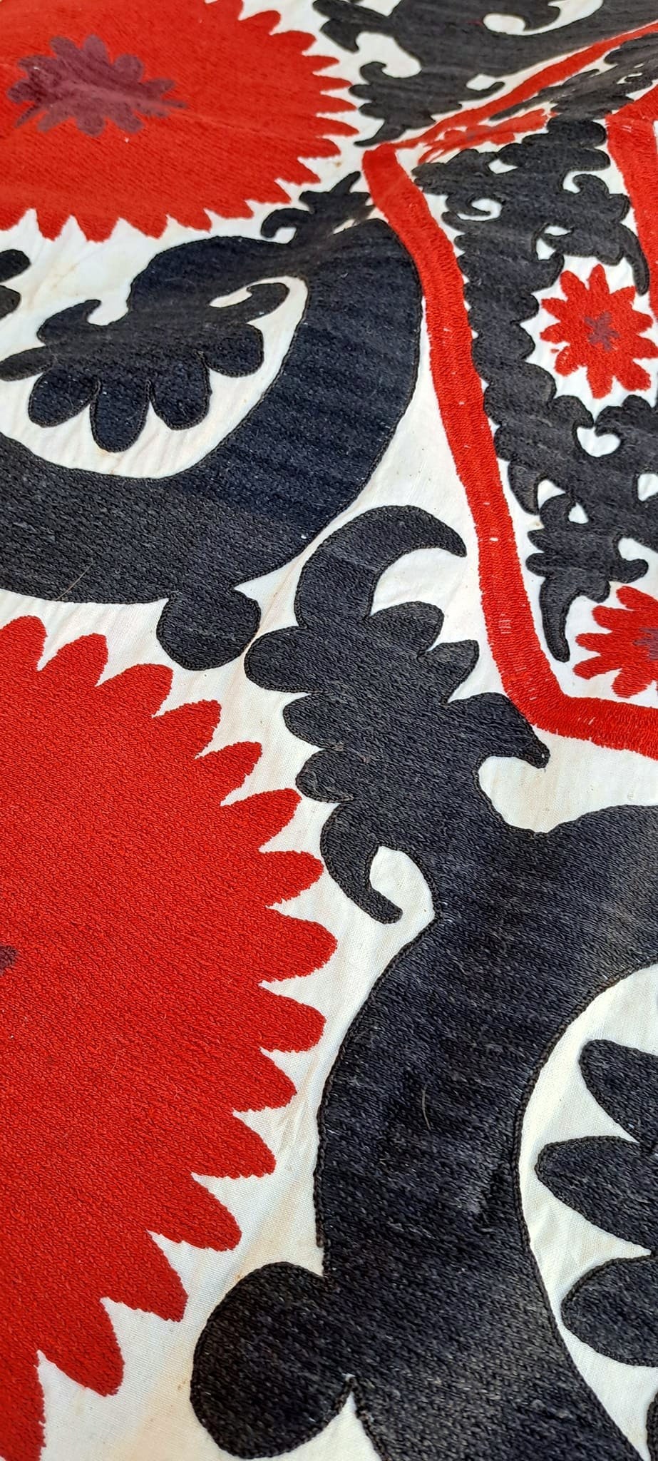The suzani was an integral part of a woman's artistic expression in Uzbekistan for hundreds of years. Traditionally, as soon as a girl was born her mother would start embroidering the suzani for her. As the daughter grew older, she would join in the process. The suzani would eventually become a part of her dowry and be used to decorate her home. These intricate and lovingly-made textiles can be used in so many ways to add texture, romance, and delight to any room.
